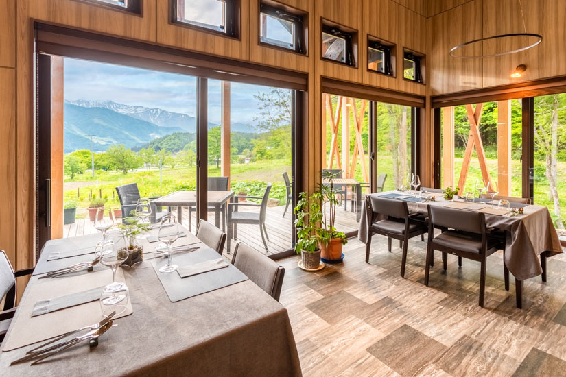 白馬農場が手がけるリストランテ「LE VERDURE(レ ヴェルドゥーレ)」は、北アルプスを望むロケーションで、季節の恵みを堪能できる一軒。春は残雪の景色とともに、自社農場で育てた野菜をはじめ、山菜や春野菜を取り入れた料理が並び、ほろ苦さや香りに大地の力強さを感じられます。小谷産仔羊のラグーや自家製小麦「ゆめかおり」を使ったパスタなど、土地の魅力を活かした一皿一皿が、ここならではの味わいを生み出しています。大きな窓の向こうに広がる四季折々の景色も、ごちそうのひとつ。