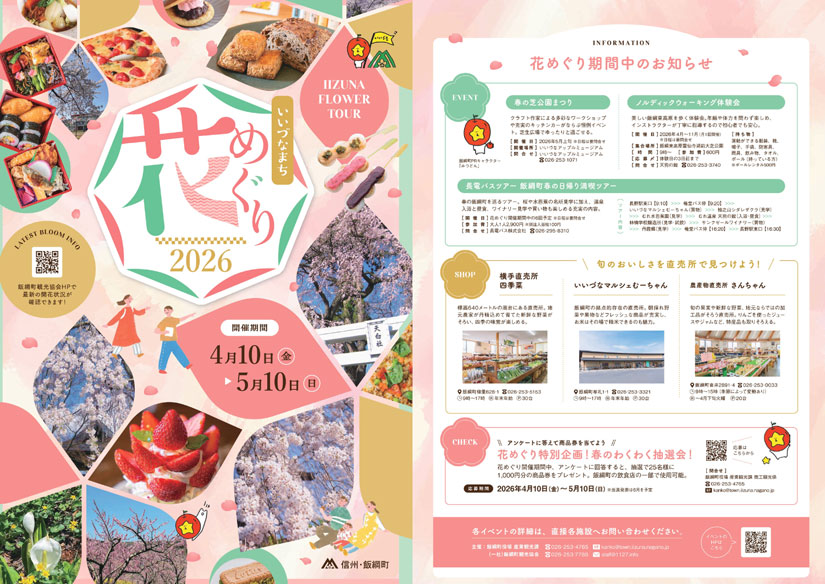 花めぐりのお供には、地元のグルメも一緒に楽しんで。廃校を活用した「いいづなコネクトEAST・WEST」ではカフェやレストランが楽しめ、「GLAMPROOK 飯綱高原」では焼きたてのピザ、「むれ温泉 天狗の館」では春のお花見三段弁当をテイクアウト限定で用意しています。「明月堂」の桜どら焼きや、「パカーンコーヒースタンド」の抹茶オレを片手に、のんびり歩くのもおすすめです。期間中は、「春の芝公園まつり」や、インストラクターと歩く「ノルディックウォーキング体験会」、桜と温泉を一日で楽しむ長電バスツアーなど、さまざまなイベントも開催!アンケートに答えると商品券が当たる抽選会も実施されます。