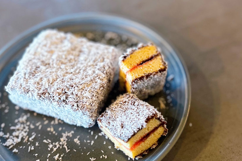 豆を購入すると、その場でローストしてくれるのも魅力。熟練焙煎士の技を再現する熱風焙煎機を導入しており、スケルトン仕様のマシンの中で豆が躍る様子は思わず見入ってしまいます。ドリップバッグも種類豊富で、「店の味を自宅で気軽に再現できる」と好評です。写真右は、甘酸っぱいいちごがアクセントの新作スイーツ「いちごソース入りラミントン」(400円)。「本日のスペシャルティコーヒー」(500円~)と合わせてどうぞ。
