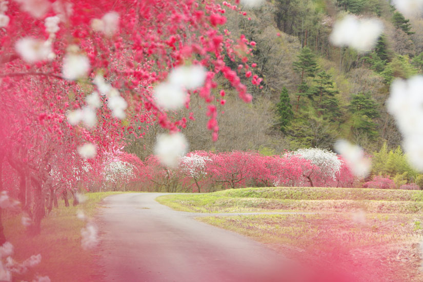一年を通じて豊かな自然が楽しめる上田市武石地域。春の季節は、色とりどりの花々が訪れる人々を出迎えてくれます。この時期にぜひ訪れたいのが、「余里一里 花桃の里」。鮮やかな白やピンクの花桃、約2,000本がおよそ4Kmにわたって咲き誇り、美しさと優しい香りに包まれながら散策を楽しめます。まるで桃源郷に迷い込んだかのような幻想的な景色がずっと続く、まさに絶景スポットです。花桃以外にも、白樺平などの高原に群生するレンゲツツジや、樹齢約130年のシダレザクラなど、様々な美しい花との出会いが待っています。