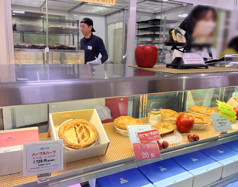 スキージャンプの金メダリストである船木和喜さんのお店。アップルパイとさくらんぼパイを販売中。うしろの厨房では船木和喜さんがパイを焼いていますよ。