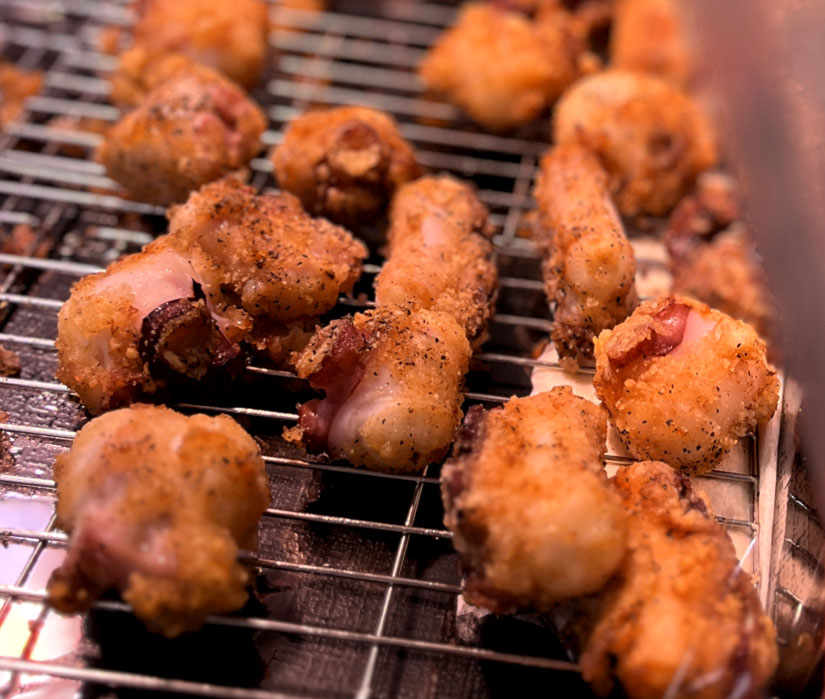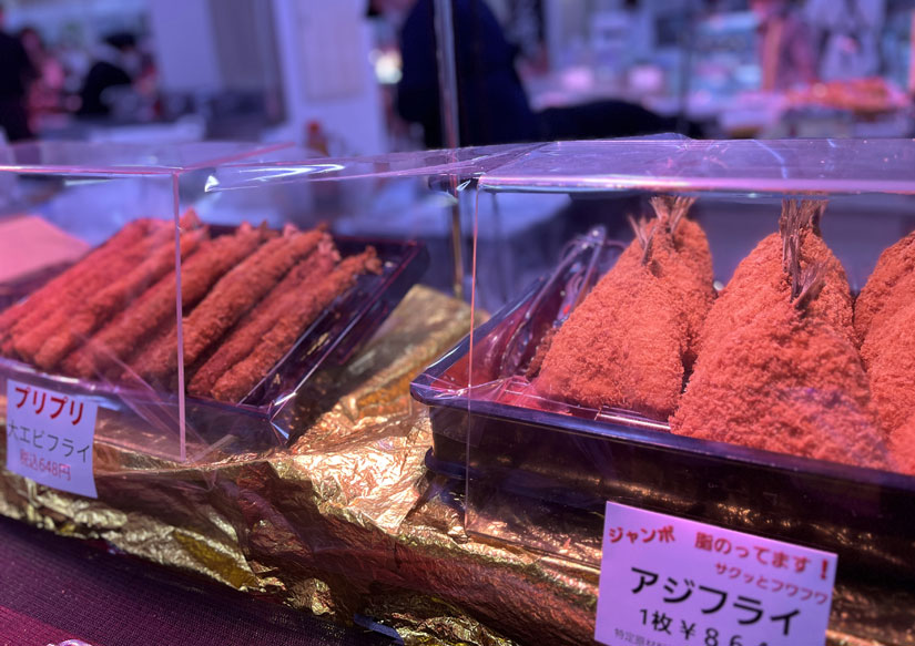 タコの唐揚げをはじめ、大きなエビフライ、大きなアジフライなどの揚げ物を実演販売中。