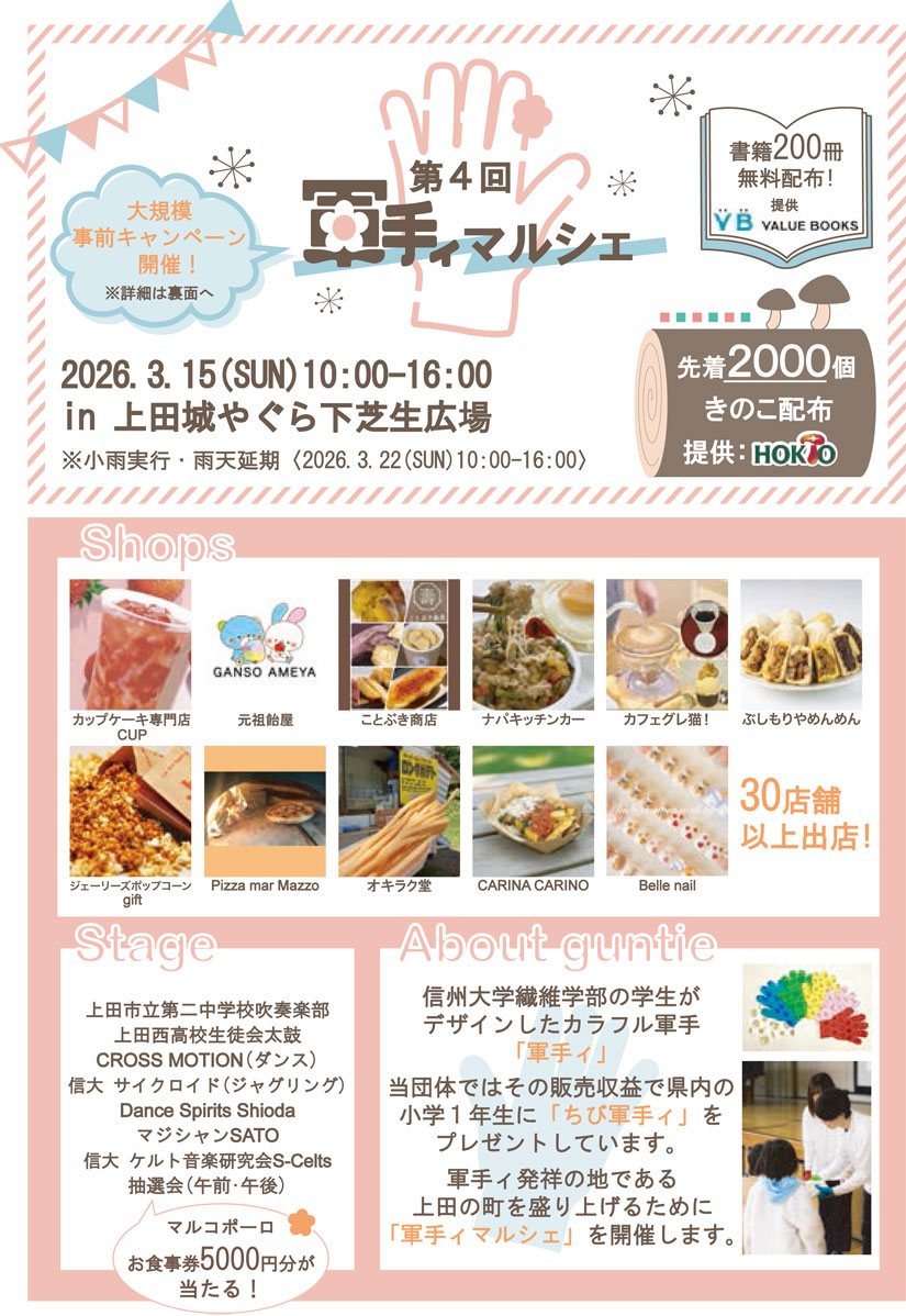 2026年3月15日(日)に、長野県上田市「上田城 やぐら下芝生広場」で『第4回軍手ィマルシェ』が開催。信州大学繊維学部の学生が中心となって活動する「ハナサカ軍手ィプロジェクト」が主催する恒例のマルシェイベント。会場には、飲食や物販など30店以上が集まるほか、ステージパフォーマンス、抽選会やスタンプラリー、輪投げやストラックアウトなど、子どもも楽しめる催しも予定。