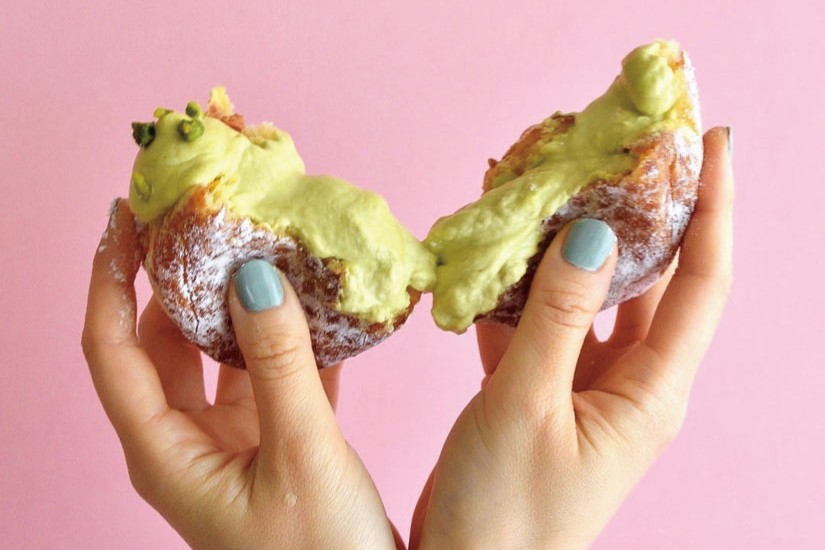九州産の生クリームと、イタリア・シチリア産のピスタチオペーストを合わせた自家製ピスタチオクリームをたっぷり詰めた「ピスタチオクリーム」(475円)。