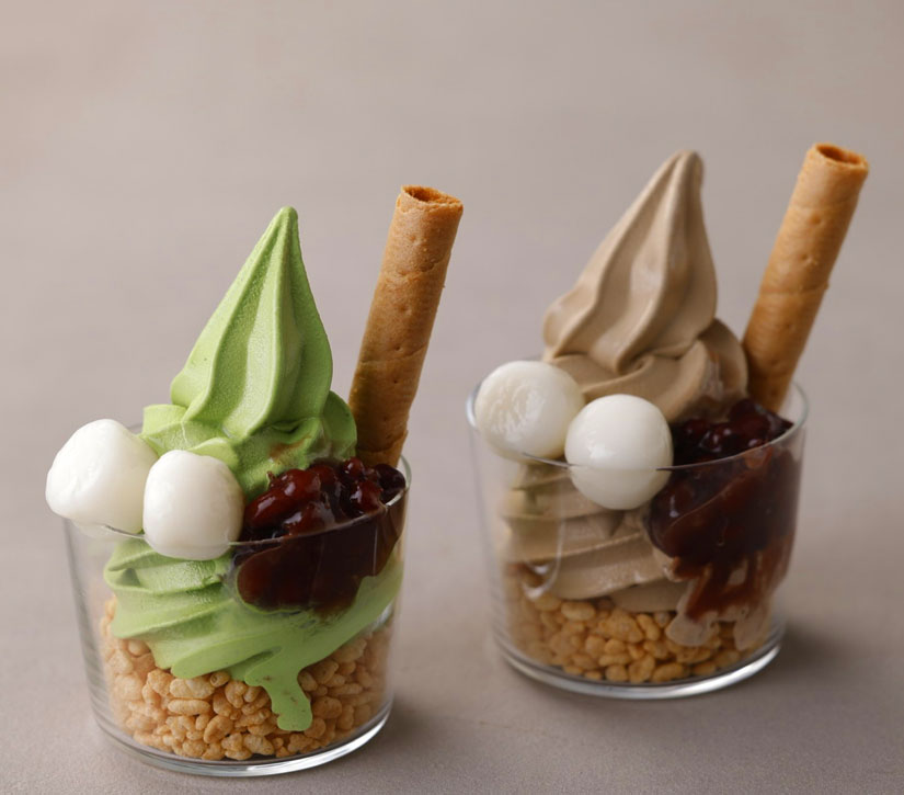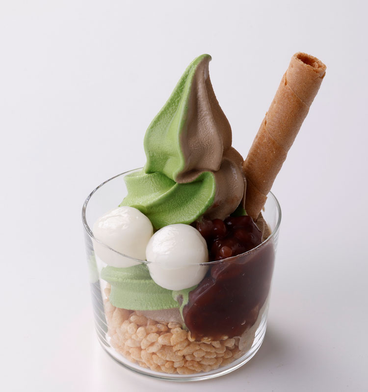 濃厚で深い味わいの抹茶ソフトクリームと、芳醇な香りとコクが広がるほうじ茶ソフトクリームに、白玉やあずきをあわせた和風パフェ。抹茶とほうじ茶の味わいを同時に愉しめる贅沢なスイーツです。