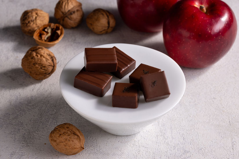 「胡桃プラリネ」はショコラオレの甘みと、クルミのほどよい渋みとコクが絶品。クルミは粗めに砕いてあるので、食感も楽しい一粒。「林檎」は、信州産リンゴのジュレ、ショコラオレのガナッシュ、香り高いアールグレイガナッシュの3層仕立て。リンゴの酸味、アールグレイの芳醇な香りを楽しんで。