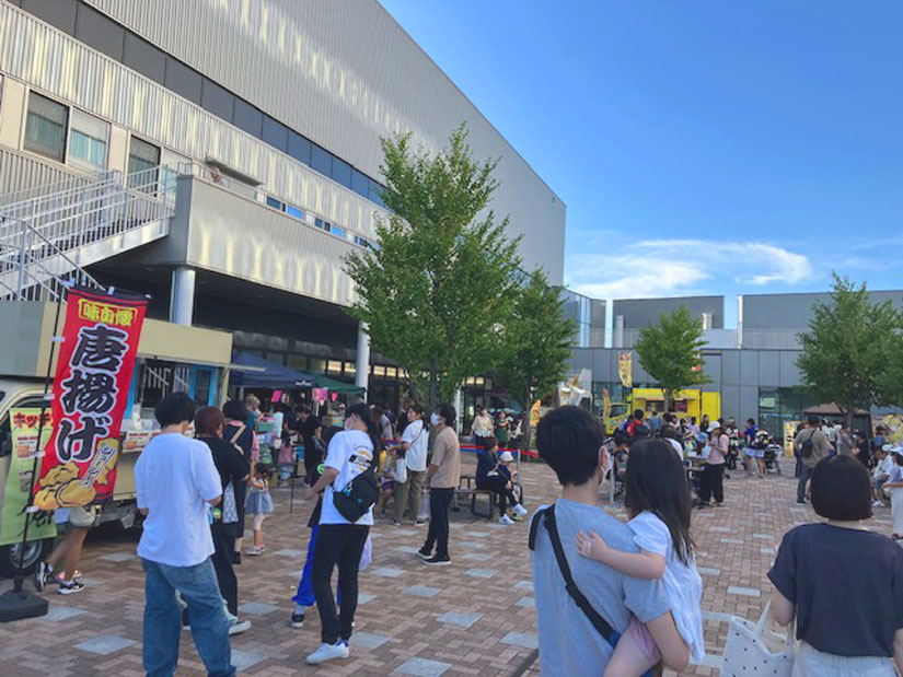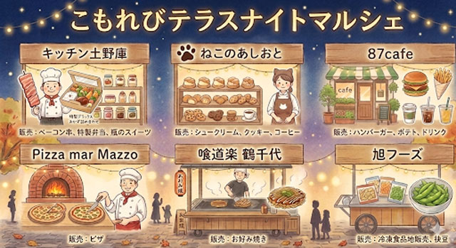 千曲市庁舎の屋外広場「こもれびテラス」を会場に、夕方からスイーツ・ベーコン串・ピザ・ハンバーガー・お好み焼きなどを提供する飲食店をはじめ、クラフト作品の販売ブースなど約20店が集結します。
