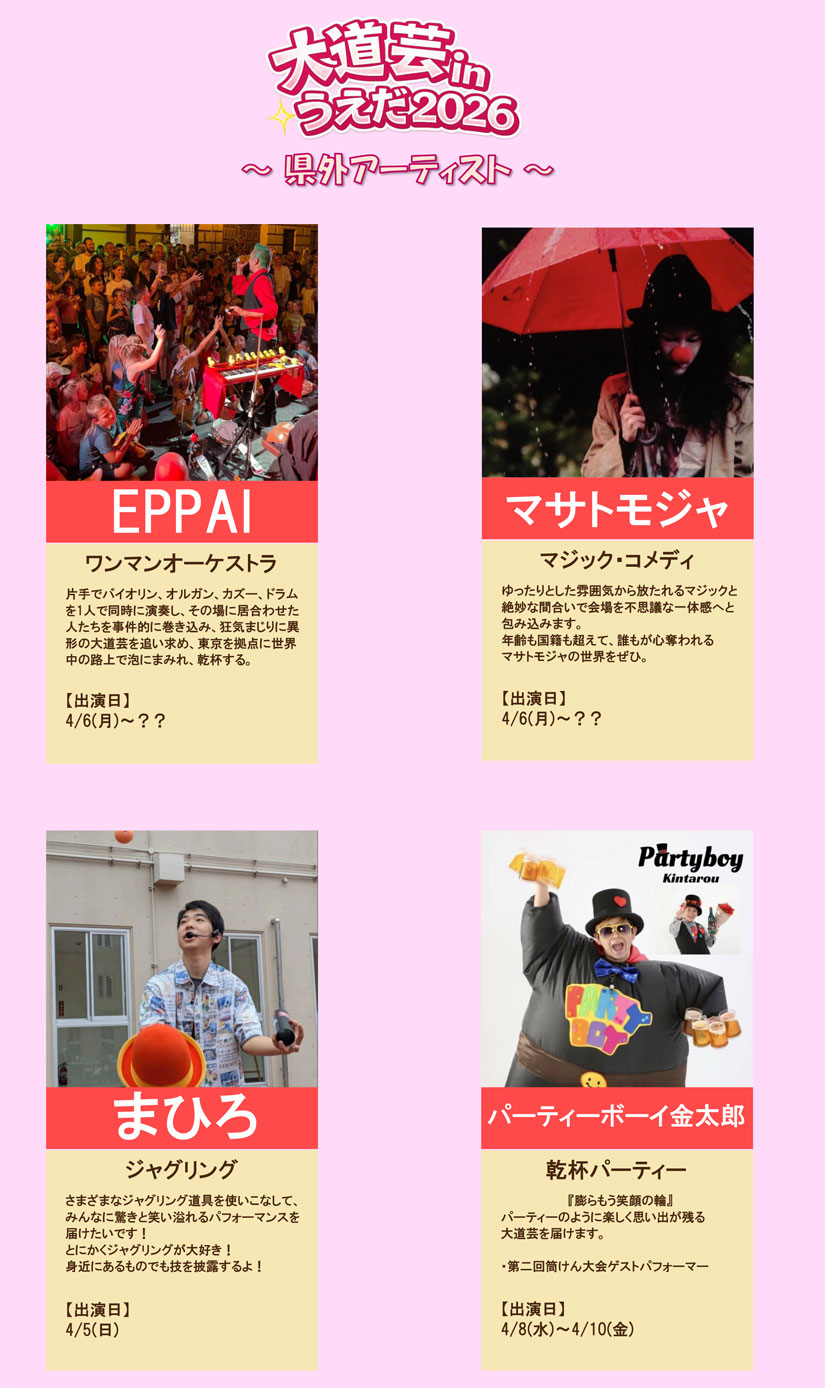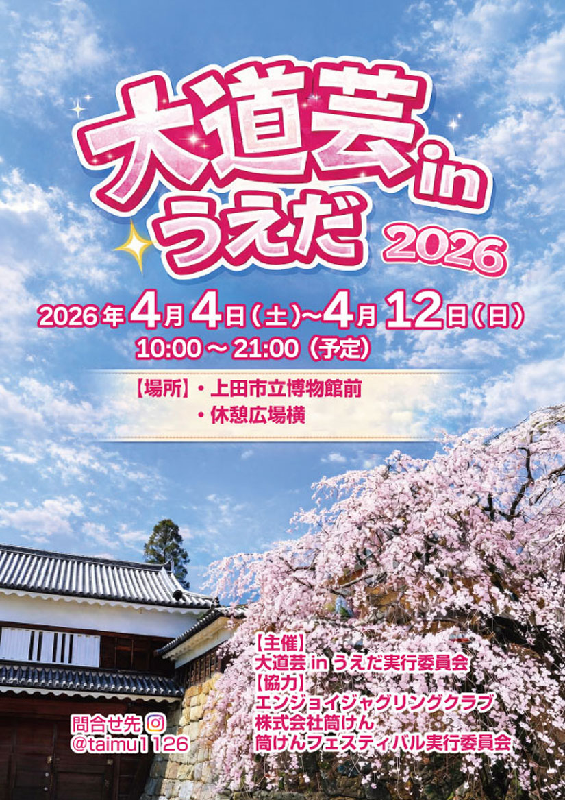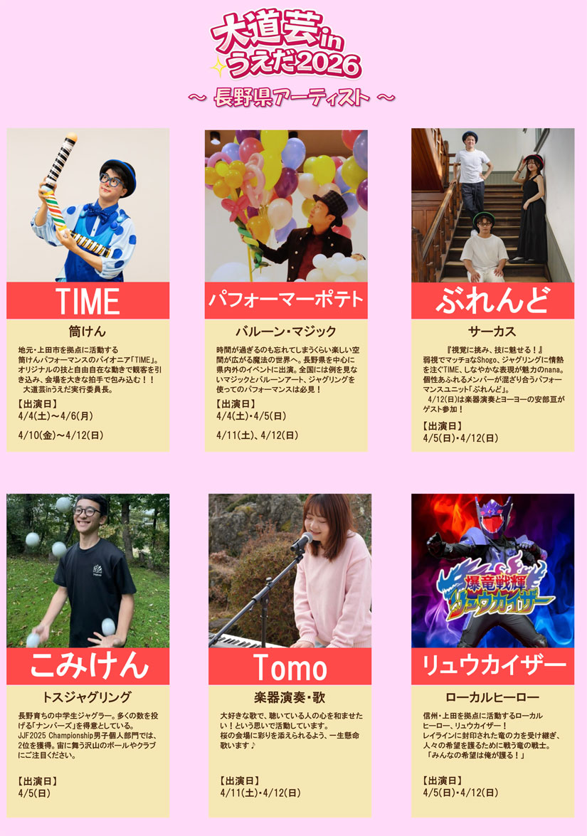 長野県上田市の「上田城跡公園」の「上田市立博物館」前と休憩広場横で、『大道芸 in うえだ 2026』が2026年4月4日(土)から4月12日(日)まで開催。『上田城千本桜まつり』期間中に合わせて行われる大道芸イベントで、長野県アーティスト6組、県外アーティスト4組の計10組が日替わりで集まります。ジャグリング、マジック、バルーン、楽器演奏など、さまざまなパフォーマンスを楽しんで。