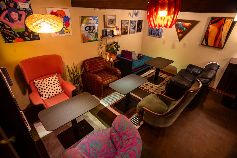 「喫茶店やカフェといえば、ケータイやパソコンで仕事や作業をしている人が多い。うちでは、ソファに座って、頭を休ませて、飾ってある雑貨や作品を眺めて、ぼーっと視線を遊ばせてほしい」と上山さんが語る通り、ここには仕事を捗らせるための設備はありません。代わりに用意されているのは、店内に飾られたセンスあふれる雑貨や、アーティストならではの視点で選ばれたアートピースです。