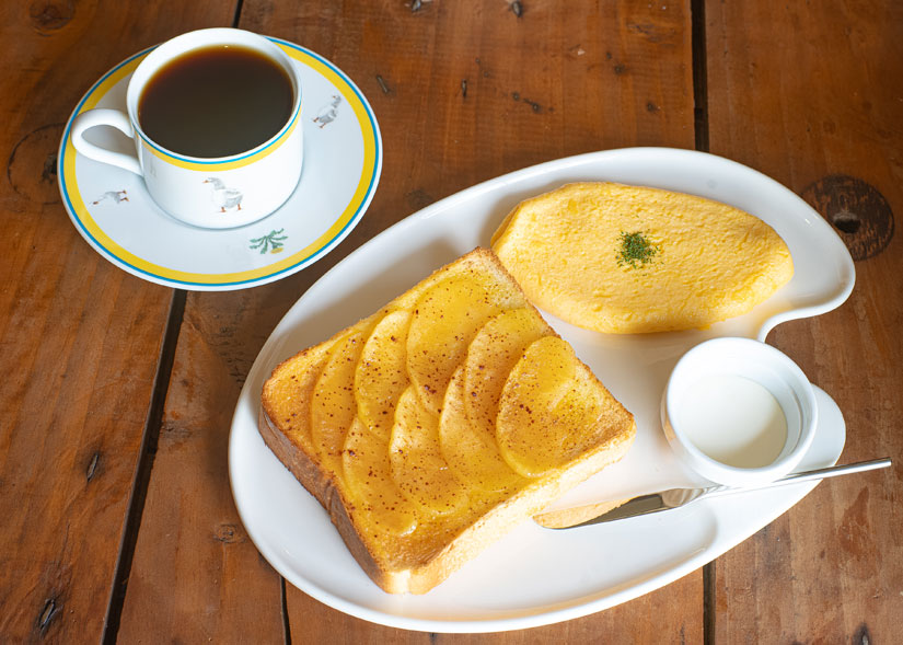 ふわふわの食感と卵の風味が魅力的な「オムレツ」(300円)は一番人気。長野県産のリンゴを使った「リンゴバタートースト」(500円)もおすすめだそう。「ブレンド」(700円)といっしょに味わって。