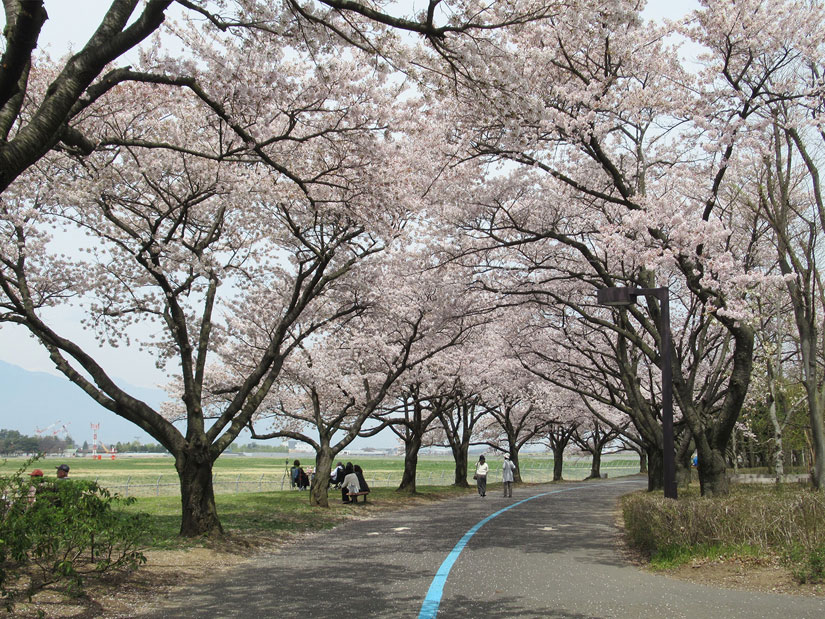長野県松本市の「信州まつもと空港」を囲む広大な敷地に広がる「信州スカイパーク(長野県松本平広域公園)」。県内最大級の規模を誇る多目的公園で、園内にはスポーツ施設やピクニック広場、遊具エリアなどが点在し、世代を問わず多くの人でにぎわいます。なかでも芝生が広がる「ピクニック広場」や「花のプロムナードゾーン」は、春になると桜が彩る人気のお花見スポットです。