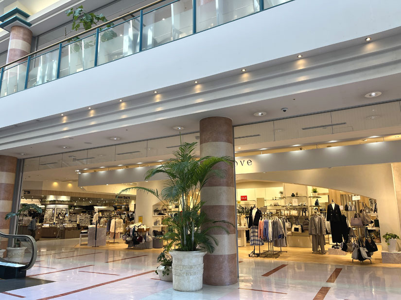 建物中央のモールエリアには、休憩スペースも設けられており、ガラス屋根を通して空の様子も感じることができます。買い物の合間にほっとひと息♪