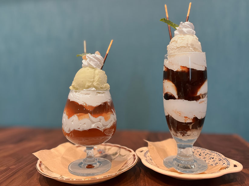 香り高い紅茶の風味を閉じ込めた「紅茶パフェ」(850円/左)と、ほろ苦さが大人な味わいの「コーヒーゼリーパフェ」(850円/右)など、自家製ゼリーを活かしたパフェも並びます。今後は旬のフルーツや自家製プリンを使ったパフェも登場予定。