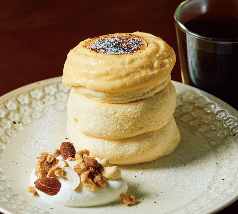 看板メニューの「ブリュレパンケーキ」(1,370円)は、長野県産のブランド卵、3種をブレンドした小麦粉、バターミルクなどの厳選素材を使用。注文ごとにメレンゲを立て、約20分かけて蒸し焼きに。ふわふわながら弾力があり、口溶けの良さが特徴です。ふわふわ生地をシンプルに味わう「プレーン」や「チョコバナナ」、「宇治抹茶」などの定番に加え、旬のフルーツを使った季節限定メニューも登場します。