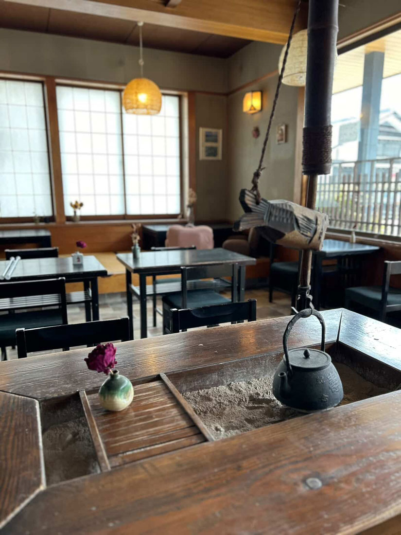 囲炉裏を活用したテーブル席は、元そば店のこの店ならでは。