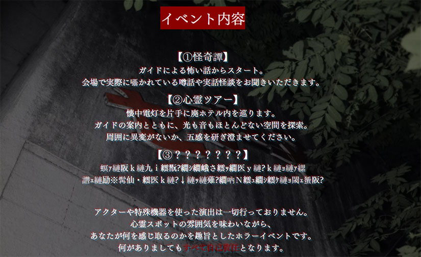 同イベントの特長は、照明や音響、アクターなどの演出を使わない“非演出型”のリアルホラー体験であること。参加者は懐中電灯を手に、普段は立ち入りが禁じられている建物内を専門ガイドの案内で探索。建物そのものが放つ空気や残された痕跡、静まり返った空間を通して恐怖を体感する事ができます。