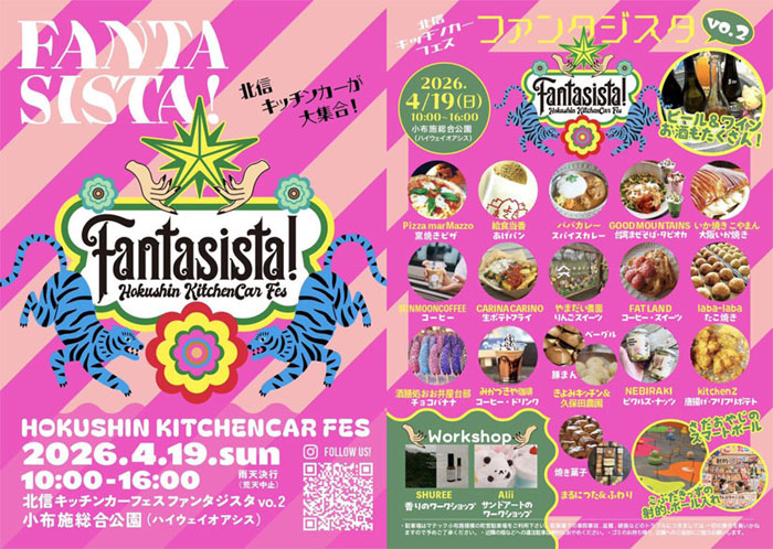 長野県・小布施町の「小布施総合公園(ハイウェイオアシス)」で、春のフードイベント『北信キッチンカーフェス Fantasista(ファンタジスタ)vol.2』が、2026年4月19日(日)に開催。