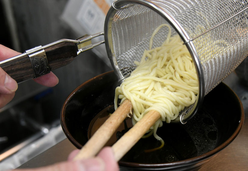地元・安曇野市の山崎製麺に特注オーダーしている中太平打ち麺はつるもち食感でスープともよく絡みます。