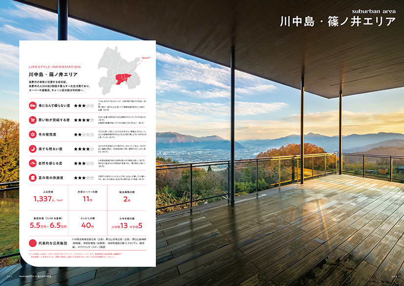 川中島・篠ノ井エリアは古くからの住宅や新興住宅地が織り混ざり住宅街として人口密度が高い場所。郊外型の大型商業施設やドライブスルー型の飲食店も多いなど、移住前の車生活よりも気軽に楽しく毎日を謳歌できるでしょう。