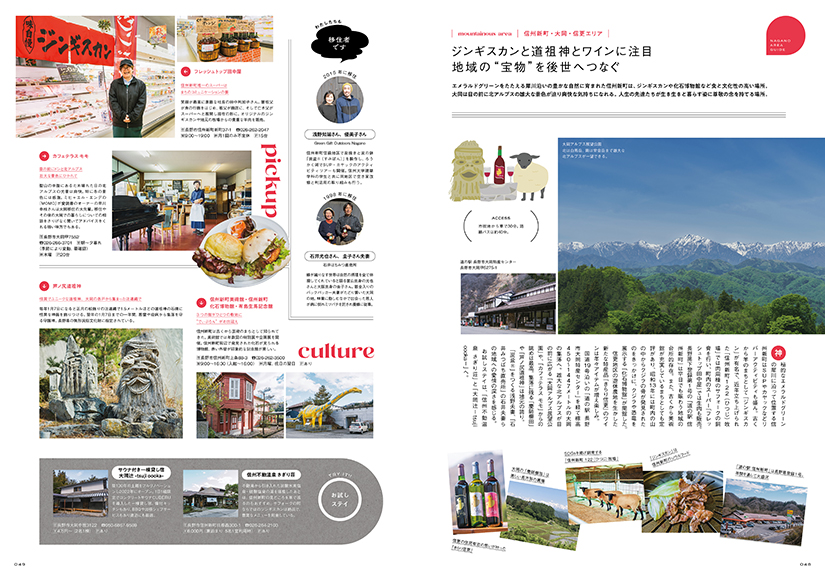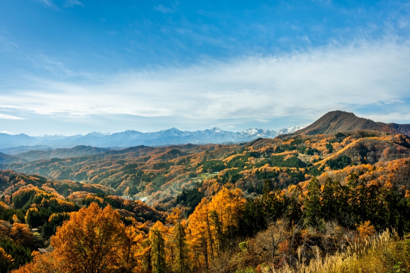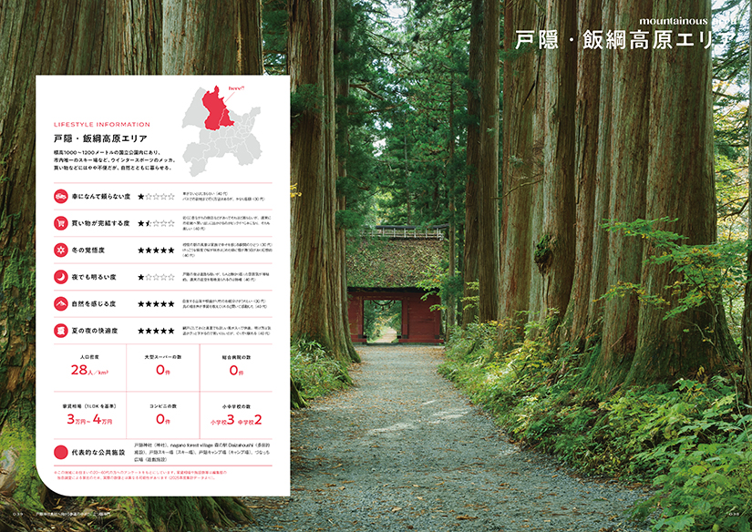 古き良き里山の風景が広がり、北アルプスを間近に見られる中条・七二会エリア。標高1000mにある神秘の雰囲気を秘めた戸隠、カラマツの木立に揺れる木漏れ日が美しい飯綱高原、手付かずのブナの原生林に抱かれた鬼無里。信州新町、大岡など市街地から車で1時間圏内の距離にありながら、静かな日々を送ることができ、新しい自分に出会える場所。