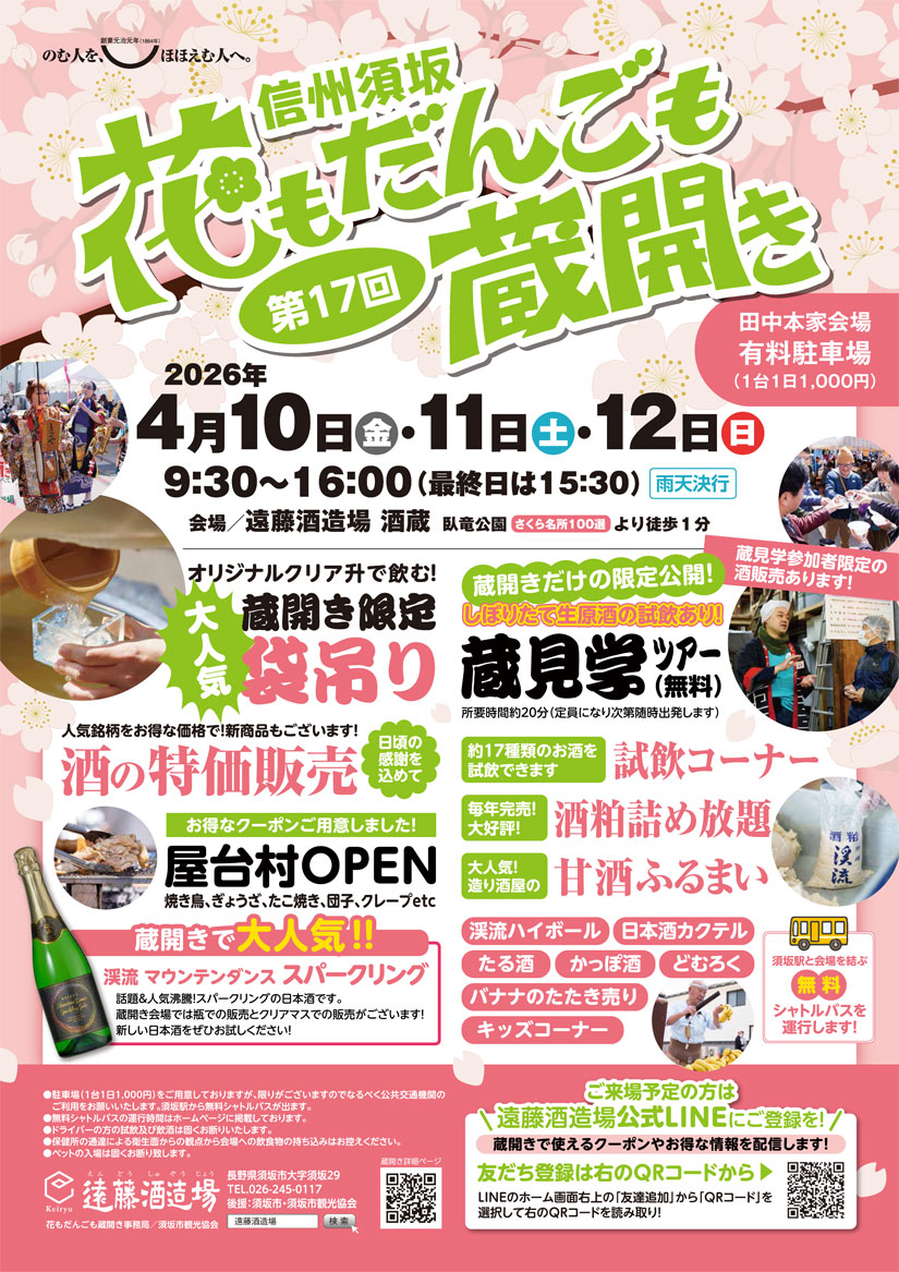 2026年4月10日(金)から4月12日(日)に長野県須坂市の臥竜公園近くにある「遠藤酒造場 臥竜蔵」で、『第17回信州須坂 花もだんごも蔵開き』が開催。桜の季節に合わせて、日本酒の試飲や屋台村の出店など、見て飲んで食べて楽しめる毎年恒例のイベント。普段は立ち入れない酒蔵の内部を見学する「蔵見学ツアー」や約17種類のお酒を試飲できる「試飲コーナー」、「酒粕詰め放題」、「甘酒ふるまい」など酒蔵ならではの催しも行われます。