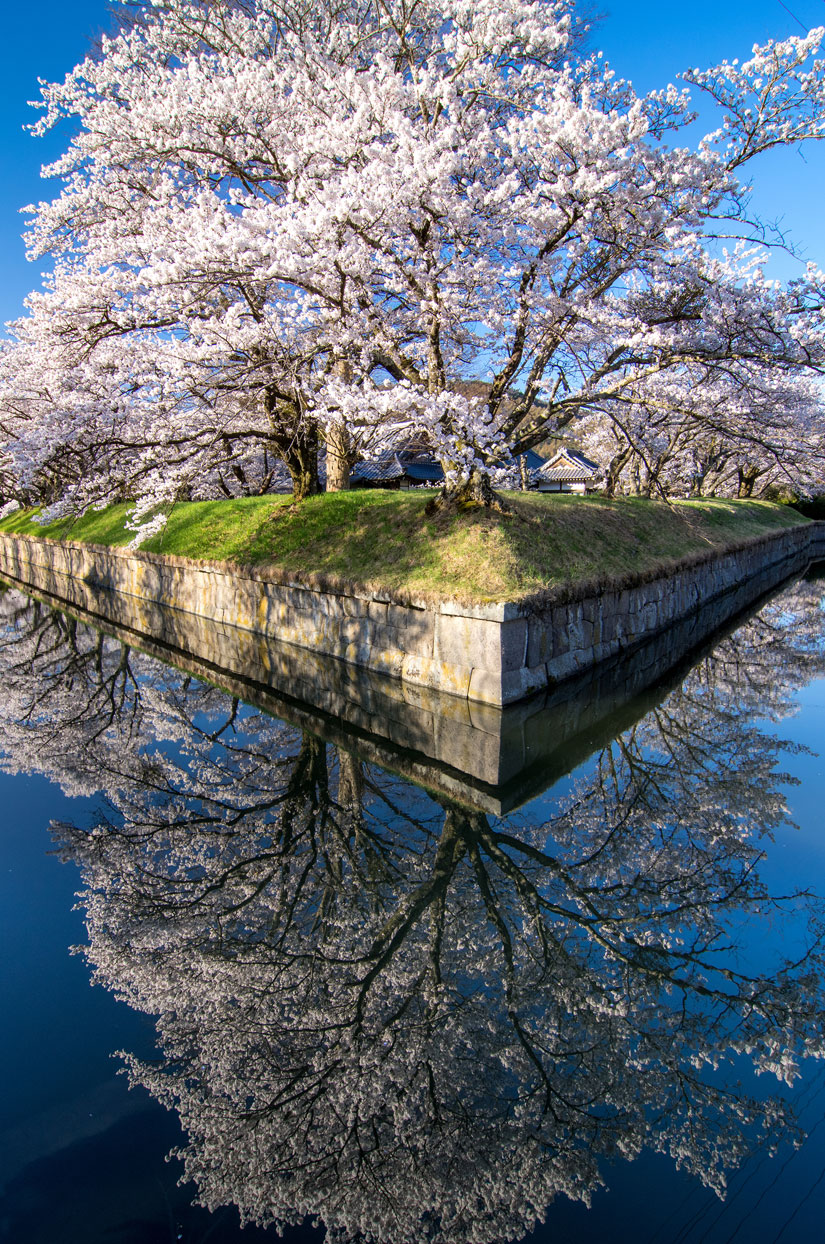 歩行者専用の散策路となっているお堀沿いからは、和洋折衷の珍しい石垣と穏やかな水面、そして満開の桜が織りなす美しいコントラストを間近で楽しめます。風のない穏やかな日には、水面に桜と石垣が鏡のように映り込む「逆さ桜」も見逃せません。