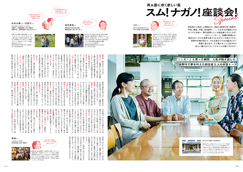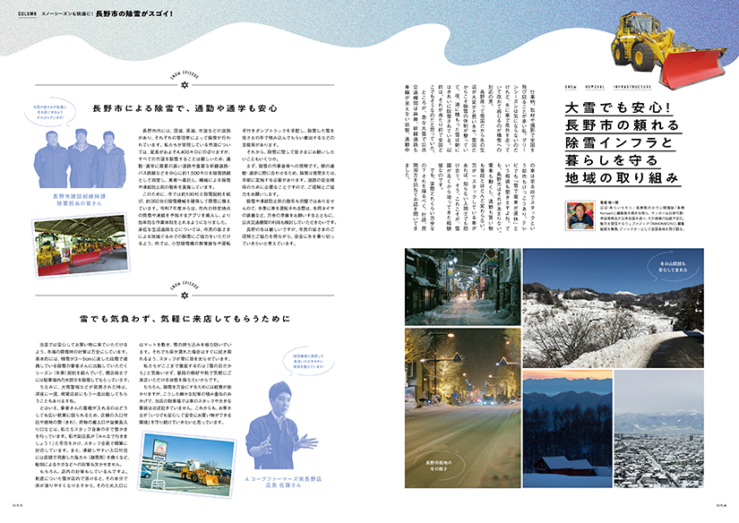 これだけでも一見の価値ありですが、この作品に負けずとも劣らない長野市の魅力をたっぷり詰め込んだ本編では、長野市の移住に精通する皆さんを集めて座談会を行ったり、すでに長野市に暮らす先輩移住者さんの話を聞いたり、長野市をエリア分けしてそれぞれの地域の魅力を紹介したり、雪国長野の除雪事情なども掲載。