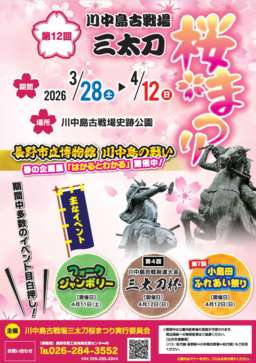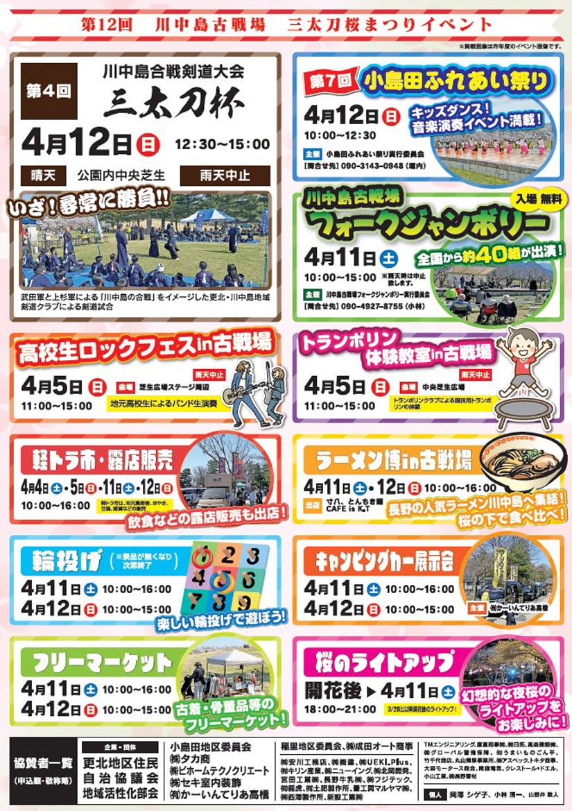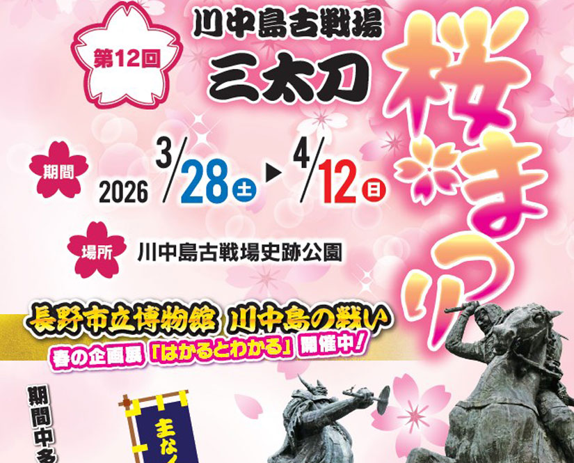 長野県長野市の「川中島古戦場史跡公園」で『第12回 川中島古戦場 三太刀桜まつり』が2026年4月12日(日)まで開催中。桜のライトアップをはじめ、全国から約40組が出演する『フォークジャンボリー』、子どもたちのダンスショー、音楽演奏イベントなどが行われる『第7回小島田ふれあい祭り』、ほかにも軽トラ市、フードの販売、『ラーメン博in古戦場』、古着・骨董品等の『フリーマーケット』など、日ごとに多彩なイベントを楽しめます。
