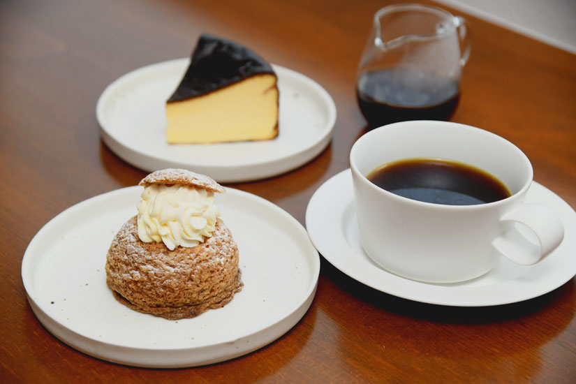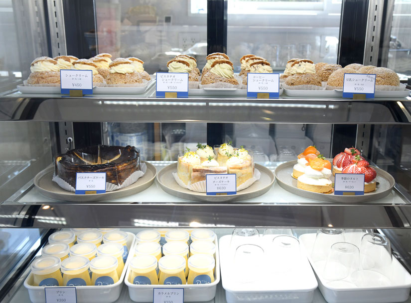 新店舗では、これまでの焼き菓子・ケーキ・コーヒーのテイクアウト販売に加え、ケーキとコーヒーはカフェ席で楽しめるように。ショーケースには、種類を充実させた大評判のシュークリームをはじめ、チーズケーキやプリンなどの生菓子が並びます。