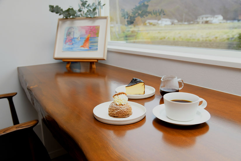 カウンター席からは草花や野菜が育てられている畑、さらには山懐の雰囲気+遠く北アルプスといつまでも眺めていたい最高のロケーション。好みのケーキとコーヒーを選んで景色とともに楽しんでみてくださいね。