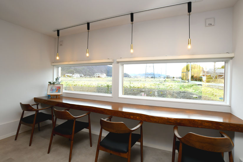 田園風景と北アルプスの山並みを望む窓際のカウンター席で、くつろぎの時間を過ごすのもおすすめ。