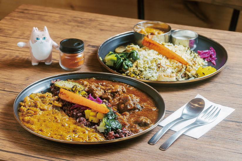 「カレー2種あいがけ」(1,400円)と「チキンビリヤニ」。少しずつ混ぜながら味の変化を楽しんで。辛さはチリパウダーで調整できます。