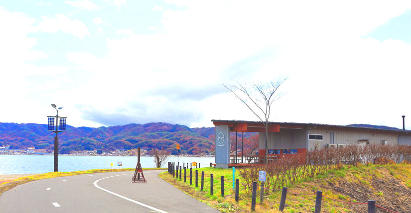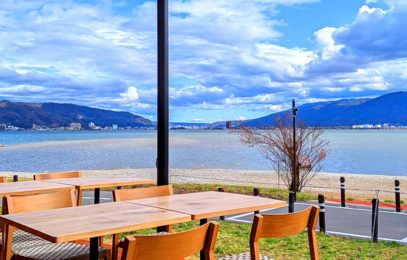 場所は週末に家族連れで賑わう赤砂崎公園近くの諏訪湖畔。サイクルスタンド完備で自転車での立ち寄りがスムーズなのはもちろん、公園の駐車場も利用できるため、車での来店も安心です。サイクリストからファミリーまで、誰もが気軽に訪れやすいアクセス環境が整っています。