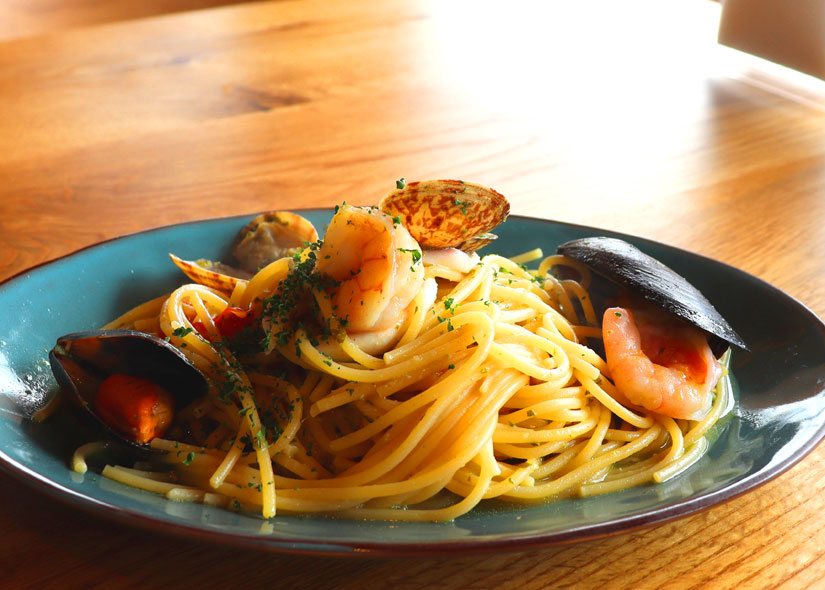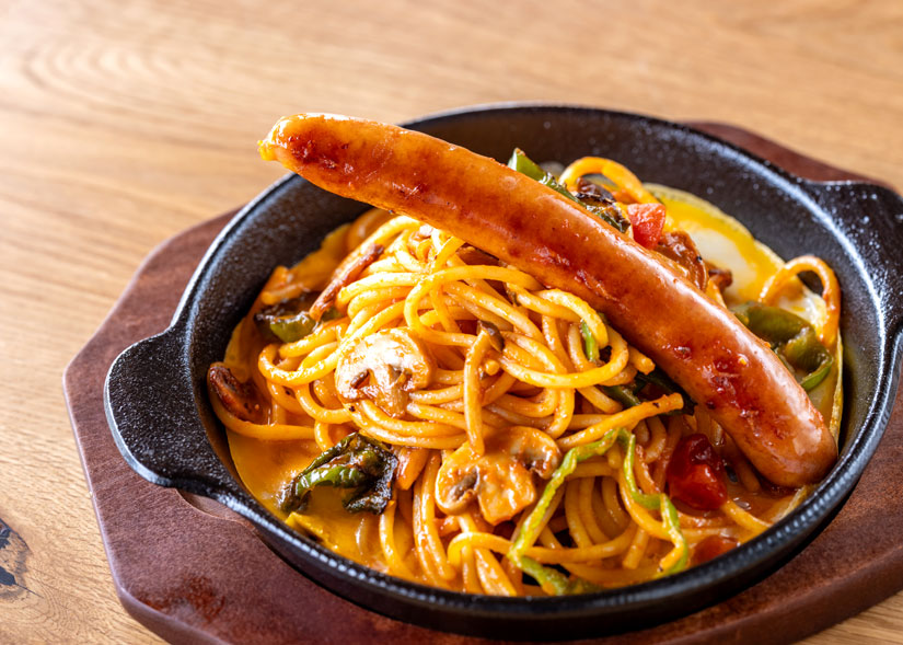 ムール貝やエビ、イカなど魚介の旨みがぎゅっと凝縮された「シーフードパスタ」や、ソーセージを丸ごと1本のせた「鉄板ナポリタン」などが揃います。
