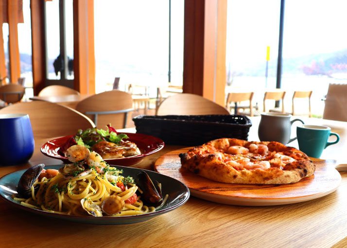テラス席を完備し、店内からも諏訪湖の大パノラマを一望できる最高のロケーションも魅力のお店。ピザやパスタ、ハンバーガーなどの食事メニューをはじめ、ソフトクリームなどのカフェメニューは、営業時間(夜8時30分LO)ならいつでもオーダー可能なので、モーニング・ランチ・ディナー・カフェを好きな時間に楽しめます。