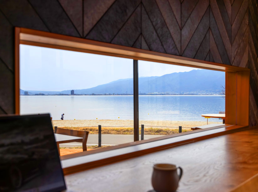 店内から臨む圧倒的なパノラマビュー!大きな窓からは、諏訪湖が一望できるだけでなく、サイクリングを楽しむ人、キラキラと輝く諏訪湖の先に八ヶ岳や富士山まで見渡せます。