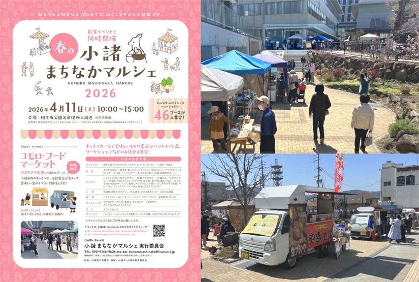 長野県小諸市の人気マーケットイベント『小諸まちなかマルシェ』が、2026年4月11日(土)に行われます。今年も食のイベント『コモロ・フードマーケット』との同時開催。