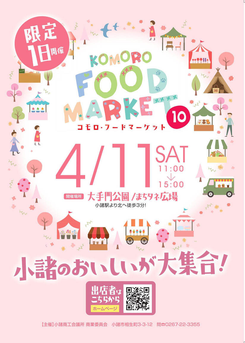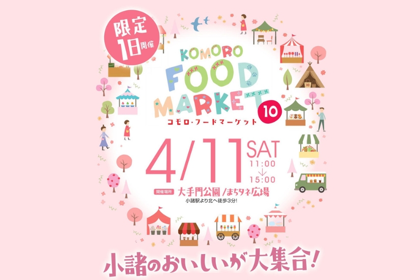 2026年4月11日(土)に、長野県小諸市「大手門公園・まちタネ広場」で『KOMORO FOOD MARKET10(小諸フードマーケット10)』が開催。小諸市をはじめとした長野県内のおいしいグルメが集まる毎回好評のフードイベント。今回は、中華点心やタイ料理、和菓子やおにぎり、カフェメニューなど、合計29店が出店を予定。