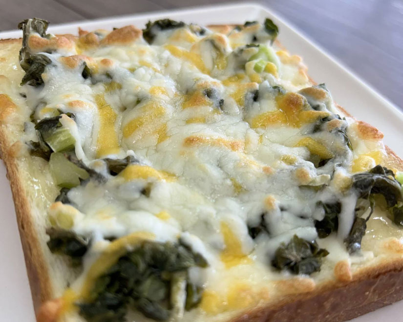 「野沢菜トースト」は、長野県を代表する食材・野沢菜を使ったトーストで、羽田さん自家製の野沢菜漬けを使用しており、深い緑色の野沢菜ととろけるチーズのコントラストも楽しい一品。オリーブオイルをかけると、風味がより引き立ち、また違った味わいが楽しめるそうで、特に県外からの観光客に人気とか。「意外な組み合わせや食べ方でおいしいと感激されていました。」