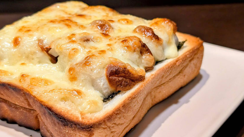 「ビタミンちくわトースト」は、ちくわの旨味と和風の味付けに、とろけるチーズが溶け合う、ここでしか味わえない一品。厚切りのパンにたっぷりのチーズがかかっていて、こんがりと焼き上げられたその見た目は、食欲をそそります!