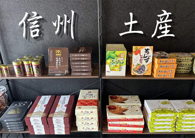 店内のお土産コーナーには、りんごやシャインマスカットを使ったお菓子をはじめ、野沢菜漬け、味噌カレー、信州限定のキャンディなど、信州限定品だけを厳選して取り揃えています。信州らしいお土産を探す際にも、気軽に立ち寄れるスポットです。