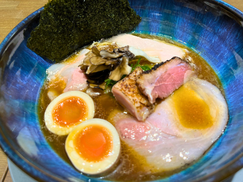 麺は、味噌とは異なり細麺を使用。トッピングのチャーシューは、ロース、肩ロース、鶏もも、鶏むね、鴨の5種類。どれも自家製で、塩や八丁味噌などでマリネしたあとじっくり漬け込んでから低温調理。舞茸と鶏ももは、提供前に炭火で炙り、香ばしい風味も楽しめます。