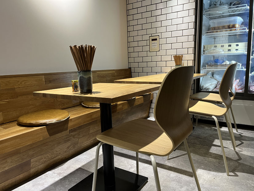 木製テーブルと椅子が配された落ち着いた空間。カウンター席を含む21席が並びます。