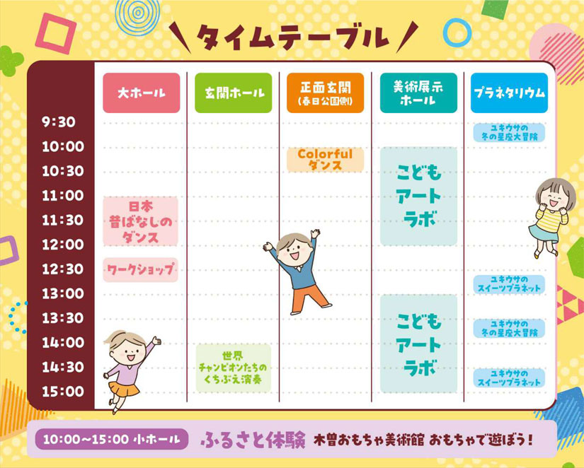 「ダンスや音楽、アートワークショップ、演劇、プラネタリウム鑑賞、木のおもちゃで遊べるコーナーなど、楽しい企画が盛りだくさんです。キッチンカーも出店しますので、ぜひご家族で一日をお楽しみください。お待ちしております!!」と主催者。