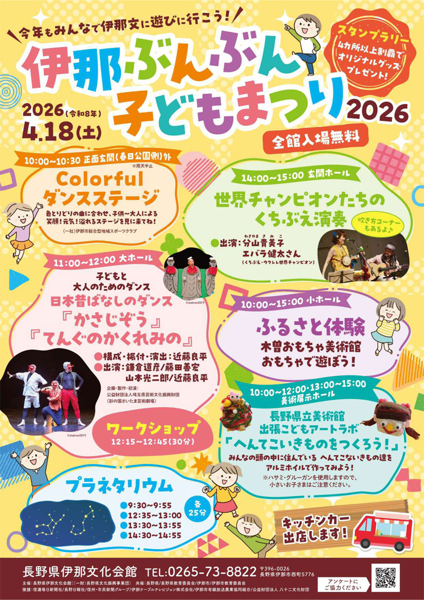 2026年4月18日に長野県伊那市の「長野県伊那文化会館」で『伊那ぶんぶん子どもまつり2026』が開催。全館を使った子どもが楽しめるお祭りイベントです。当日は世界チャンピオンたちのくちぶえ演奏、日本昔ばなしのダンス、長野県立美術館出張こどもアートラボなどやプラネタリウム、屋外ダンスステージまで、さまざまなプログラムが行われます。4イベント以上を回るスタンプラリーもあり、オリジナルグッズのプレゼントも。また、当日はキッチンカーなども並びます。