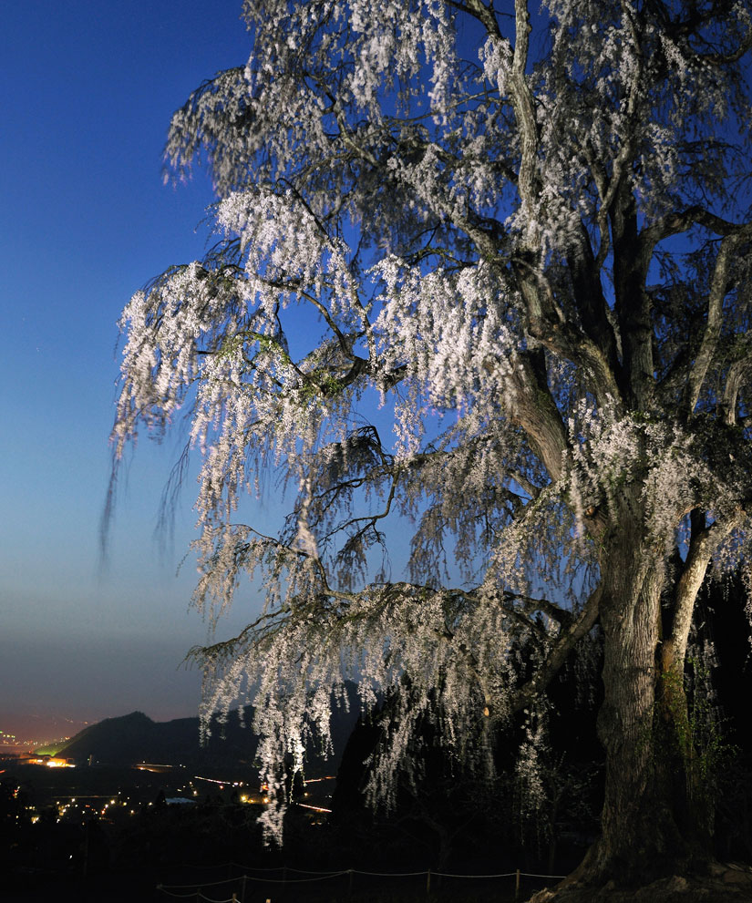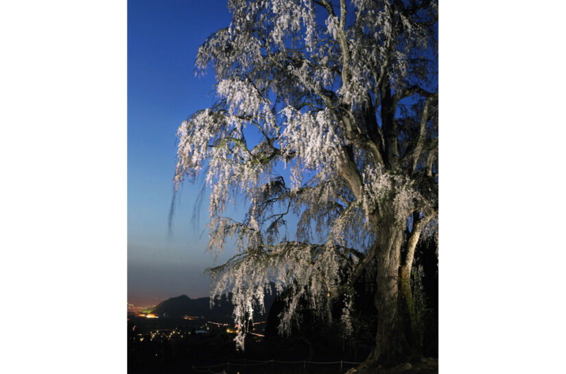 長野県高山村に咲く「水中(みずなか)の枝垂れ桜」。樹齢約260年、幹周4m、高さ22m、樹冠径およそ12mを誇る一本桜で、満開の時期には薄緋色の花が滝のように咲きます。