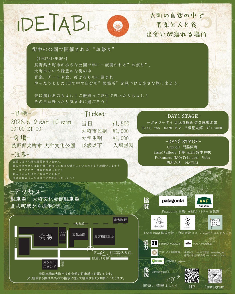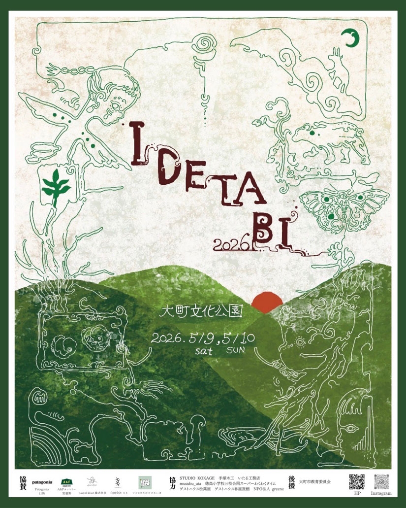 長野県大町市の「大町文化公園」で『IDETABI’26(イデタビ’26)』が2026年5月9日(土)、5月10日(日)に開催。コンセプトは、自然の中で音とアートがつながる“お祭り”。会場では、総勢17組が出演する音楽ライブやライブペイント、飲食店&ハンドメイド雑貨が集まるマーケットも行われます。イベント参加に必要なチケットは公式HPで販売中。