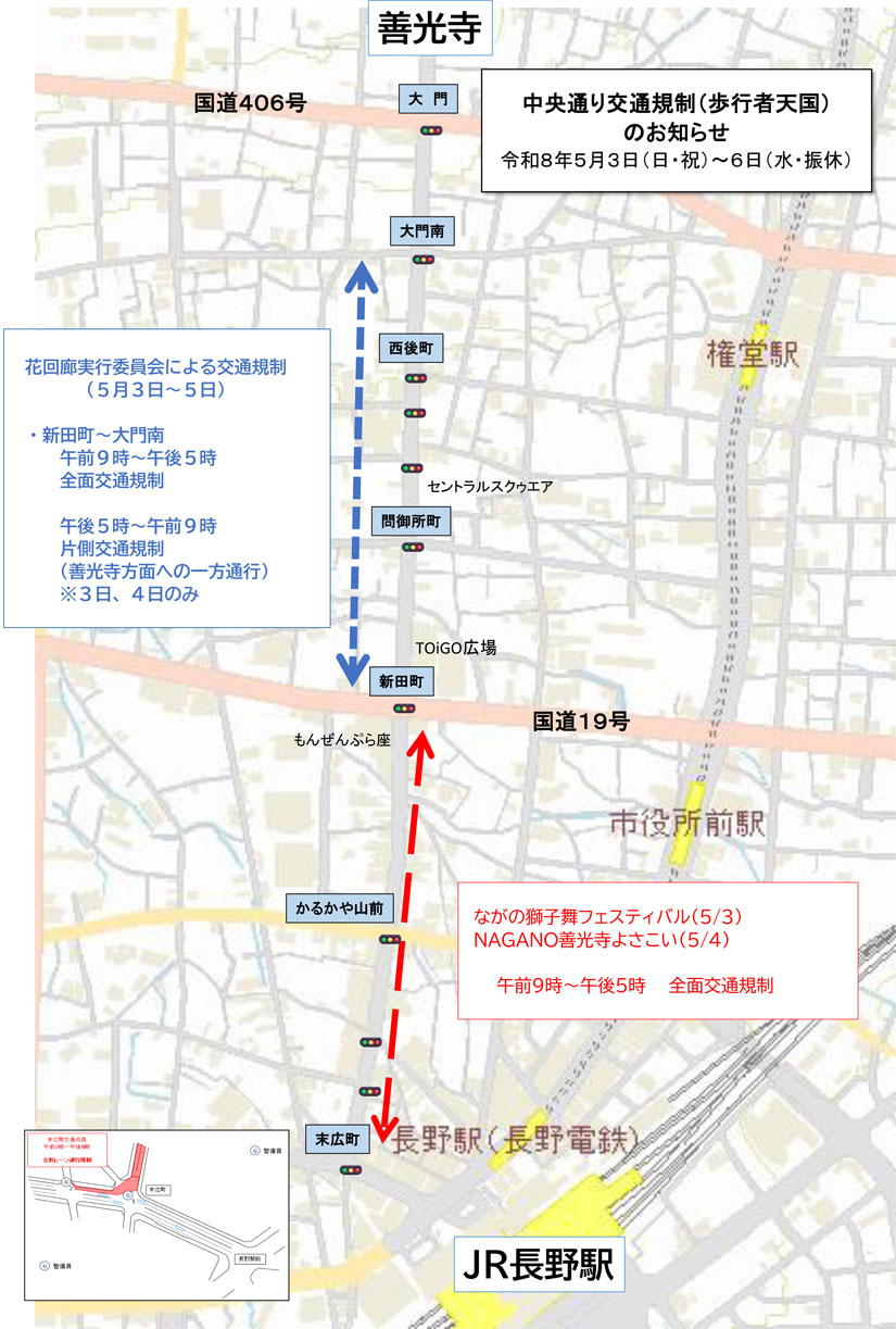 当日は、9時から17時まで中央通りが歩行者天国になり、車両の通行が制限されます。