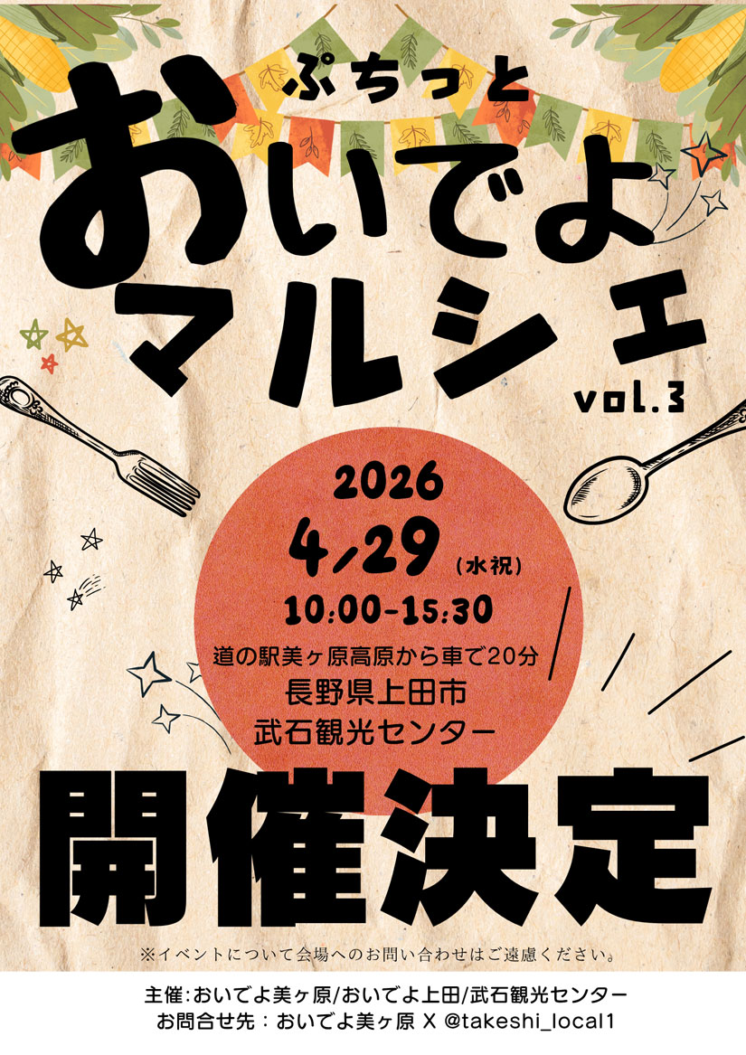 主催は元・上田市地域おこし協力隊(武石地域担当)でX情報発信している「おいでよ美ヶ原」と、「おいでよ上田」を運営する上田メディアファクトリー。ビーナスラインの冬季閉鎖解除直後という時期に合わせて開催されます。