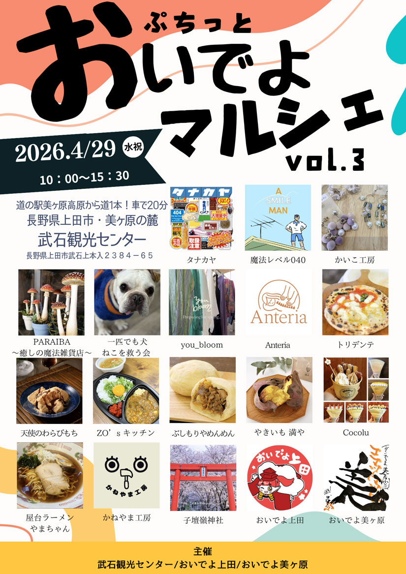 2026年4月29日(水・祝)に長野県上田市「武石観光センター」で『ぷちっとおいでよマルシェvol.3』が開催。上田地域及び美ヶ原・ビーナスラインの活性化と地域間交流を目的とした同イベント。今回は会場にスイーツやピッツア、ラーメン、雑貨、古本など19店が集結します。